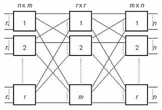 The middle switch in Fig-5 can be decomposed like Fig-6 with 3 stage clos with 2x2 switches.